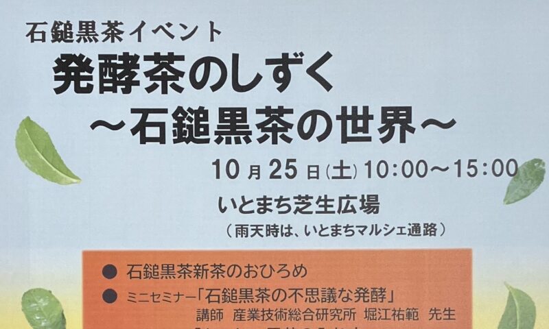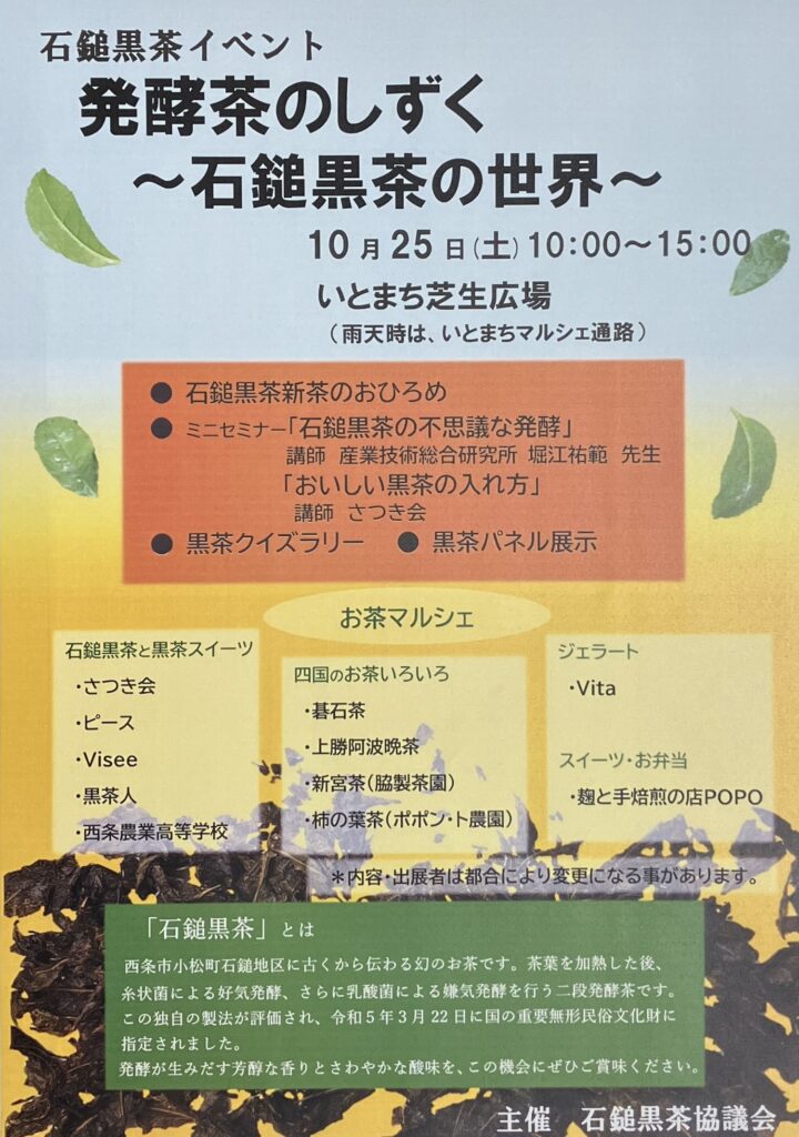 石鎚黒茶協議会主催のイベント「発酵のしずく~石鎚黒茶の世界~」が、西条市朔日市の「いとまち」芝生広場において、開催されました。石鎚黒茶協議会は、4つの石鎚黒茶製造者団体・愛媛県・西条市が構成員で、石鎚黒茶の伝承されてきた歴史を尊重しつつ、重要無形民俗文化財に指定された製造技術の継承、生産振興・ブランド化等に取り組み、地域の活性化を図ることを目的にしています。イベントの主な内容は、石鎚黒茶の新茶試飲、ミニセミナー、黒茶クイズラリー、黒茶パネル展示、お茶マルシェなどでした。開会行事の後、事務局ブースで石鎚黒茶を製造している4つの団体の新茶を広く来場者の皆様に試飲していただき、イベントが始まりました。