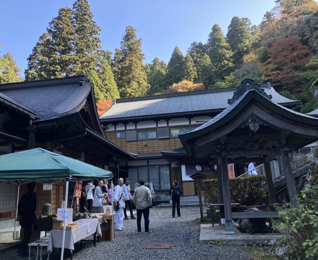 四国八十八ヶ所第60番札所の横峰寺の奥の院「星が森」において柴燈護摩法要が開催され、それに合わせて、参拝する方たちに恒例の「おもてなし茶会」を開くとともに石鎚黒茶の販売をさせていただきました。柴燈護摩とは、野外に護摩木やわらなどを積み上げ、そこへ仏菩薩を招き点火します。その火により煩悩を焼き尽くすとともに、家内安全、五穀豊穣などを祈願するという行事です。奥の院「星ヶ森」は、弘法大師が厄よけや開運を星に祈る「星供養」をここで行ったと伝えられています。当日は、お天気に恵まれて星が森の鉄鳥居越しにくっきりと石鎚山を望むことができました。両手を合わせるとすべてのご利益をいただけたような気がしました。そして、温かいおうどんをいただき山を下りました。