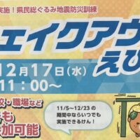 Viseeでは、愛媛県の行う「シェイクアウトえひめ」のプラスワン訓練として、「マグニチュード9の地震が発生した後、西条市には3時間後の6mの津波が到達するという津波警報が発令された」との想定で避難訓練を行いました。参加者は、それぞれがその場で「(1)まず低く=Drop!」→「(2)頭を守り=Cover!」→「(3)動かない=Hold On!」の安全確保行動を約1分間行いました。そして、点呼後、徒歩で第1次避難場所の西条市総合福祉センターまで避難しました。