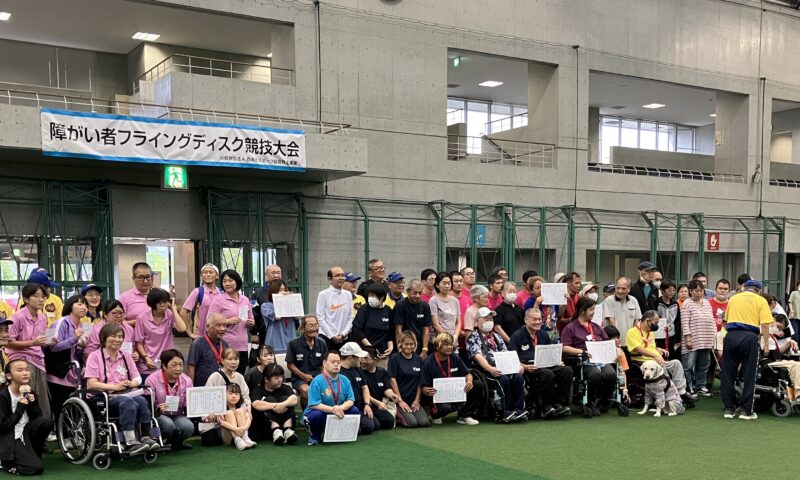 西条市河原津にあるビバ・スポルティアで開催された「第11回西条市障がい者フライングディスク競技大会」に利用者さん8名が参加しました。