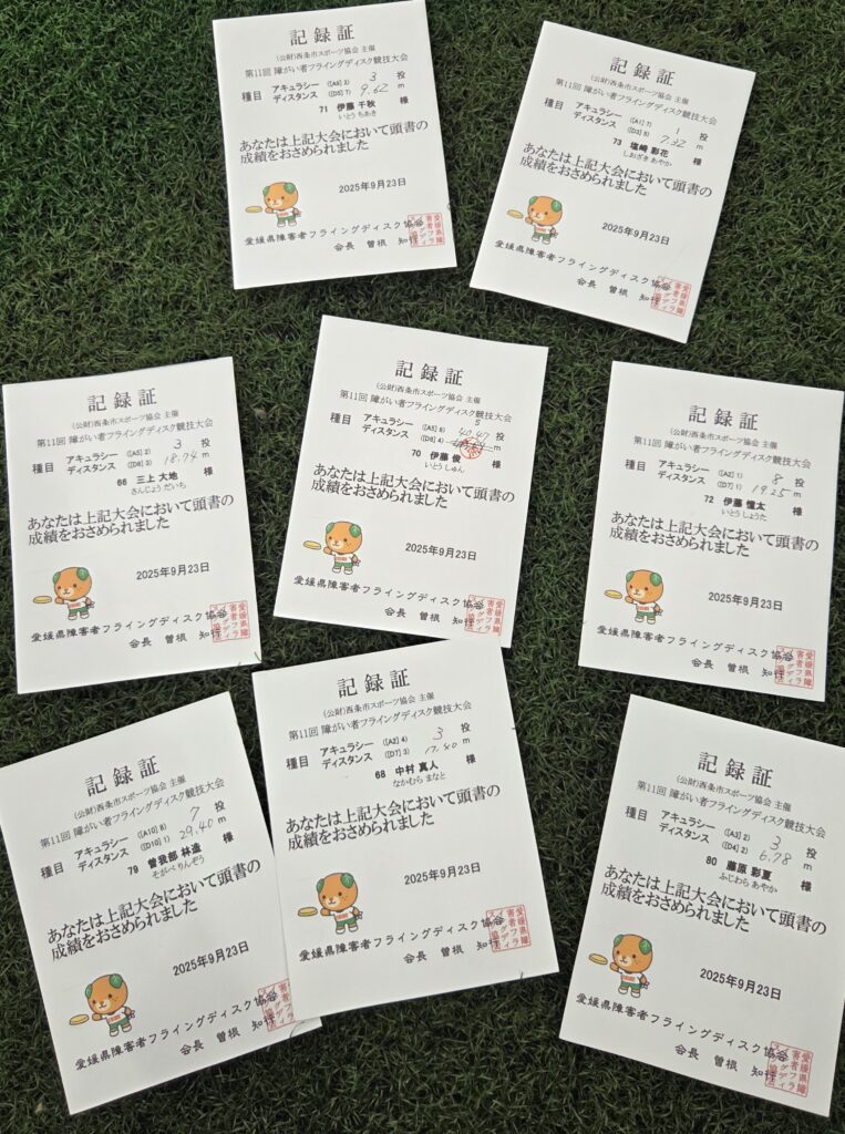 ディスタンスでは10月に滋賀県で開催される第24回全国障がい者スポーツ大会に愛媛県代表として出場するViseeの利用者さんが40.47mの記録で見事優勝しました。閉会式では賞状とメダルを授与され、多くの方から拍手をいただき、とても嬉しそうでした。