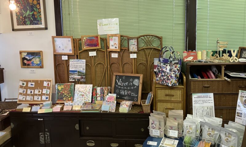 10月4日~30日まで、西条市新市にあるアトリエ工房「竹とんぼ」様のご理解とご協力によりまして、Viseeアーティストの絵画作品約10点とブローチ・ブレスレット・ヘヤバンドなどの雑貨を展示・販売しています。同時に、「はなグループ作品展」を開催しています。はなグループさんは、田中ちえこ様が講師で、第1・第3金曜日の月2回、Viseeこまつにおいて、布や紙テープなどを使ったクラフト制作を行っています。モットーは、「笑って作れてしあわせです!」だそうです。田中様にはViseeのクラフト教室講師として、長年、指導していただいております。 お近くにお出かけの際には、是非、お立ち寄りください。